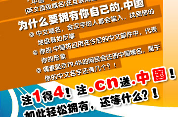 2009年5月,“.中国”将写入全球根域名系统,融入国际互联网,从此,无论在世界任何地方都可以畅通无阻的对包含着汉字的中文域名进行访问。其实每个人都拥有属于自己的那个.中国,它不但承载了特有专属的网络品牌,还预示了新的一年我们可能会面对的新的发展机遇,或者新的挑战。很神奇么,那就来试一试