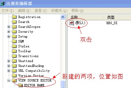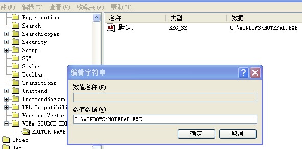 二、打开HKEY_LOCAL_MACHINE\SOFTWARE\MICROSOFT\INTERNET EXPLORER,在其下新建一个项“VIEW SOURCE EDITOR”,再在“VIEW SOURCE EDITOR”下新建一个项“EDITOR NAME”,右击右侧窗口中的”默认”将数值设为更换程序的路径及文件名。改成记事本,如下图所示