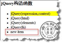 其中$('<li>new item</li>')将其中的字符串转换为DOM对象,然后通过append()函数加入ul对象的最后。