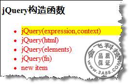 jQuery构造函数中还可以真接传入DOM对象,如document,或jQuery对象(当然就没什么意义)。ready()函数为document添加事件处理函数,将ul的颜色设为红色。