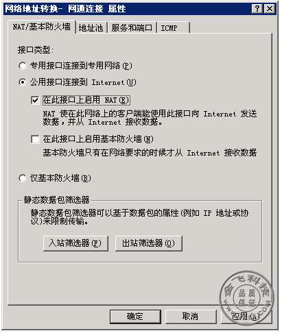 接下来,需要配置“NAT和基本防火墙”,否则客户端连接上后将无法通过这台VPN访问互联网。选中“XXx(本地)”->“IP路由选择”->“NAT/基本防火墙”,点击右键并“新增接口”,选择用来连接外部网络的接口,通常是“本地连接”,在弹出的对话框中选择“公共接口连接到Internet”,并选上“在此接口上启用NAT”,确定。