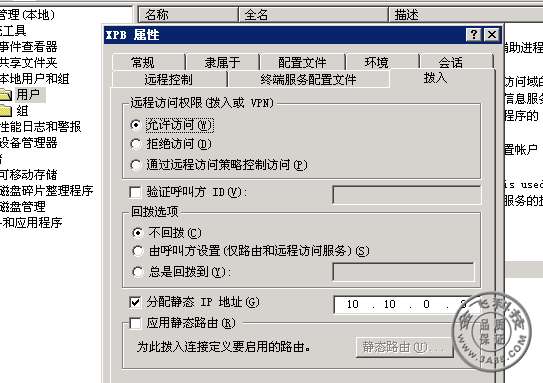 至此,VPN服务器配置完成。最后,您需要进入 我的电脑(右击)/管理/本地用户和组/用户 中新增可以进行VPN连接的客户端用户。新增好后,需要在此用户上点击右键,选择属性并切换至“拨入”标签,在“远程访问权限(拨入或 VPN)”下选中“允许访问”。