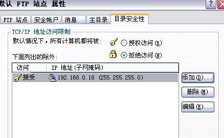 如果想要授权一台或者一组客户机访问此FTP站点,则先勾选“拒绝访问”,然后在下拉列表中添加要授权访问的计算机。