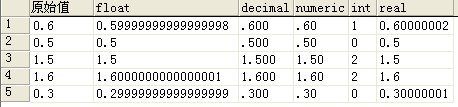 数据库中存储了0.5没问题,当使用0.6的时候,得到的确是0.59999999999999998,使用1.6得到的是 1.6000000000000001,0.3得到的是0.29999999999999999,很奇怪啊!