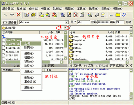 6.连接成功后的界面如下图所示。左上框为本地目录,您可以通过 1 处的下拉菜单选择您要上传文件的目录,选择后该目录下的所有文件都会显示在这个框里。 选择您要上传的文件,并点鼠标“右链”->“上传”, 这时在队列栏里会显示正在上传及未上传的文件, 当您的文件上传成功完成后,在命令栏里会出现“传送完成”的提示,此时在过程目录栏里就可以看到您上传的文件了。
