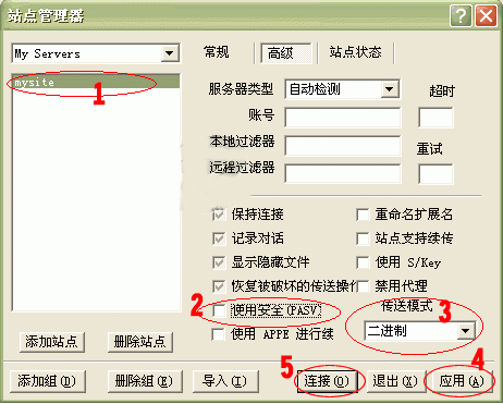 4.点击上图 6 处, 切换到“高级”标签(如下图)。 在1处选中刚建立的站点名称(mysite),将2处的选钩去掉,在3处的“传送模式”选择二进制,点击4处“应用”。 至此您的FTP站点已经建立成功;