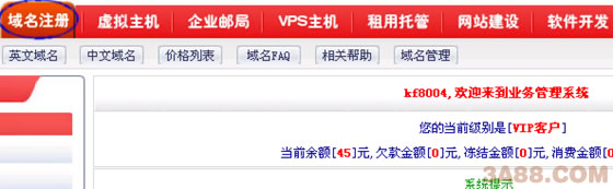 2、进入 管理中心 后,可以看到自己当前的帐户余额、财务信息等情况。然后点击 域名注册 链接,如下图:
