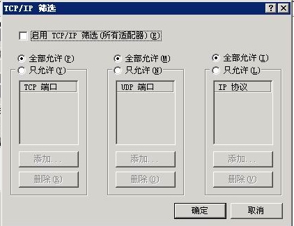 这里我们按照所需要的服务开放响应的端口。在2003系统里,不推荐用TCP/IP筛选里的端口过滤功能,譬如在使用FTP服务器的时候,如果仅仅只开放21端口,由于FTP协议的特殊性,在进行FTP传输的时候,由于FTP 特有的Port模式和Passive模式,在进行数据传输的时候,需要动态的打开高端口,所以在使用TCP/IP过滤的情况下,经常会出现连接上后无法列出目录和数据传输的问题。所以在2003系统上增加的windows连接防火墙能很好的解决这个问题,所以都不推荐使用网卡的TCP/IP过滤功能。